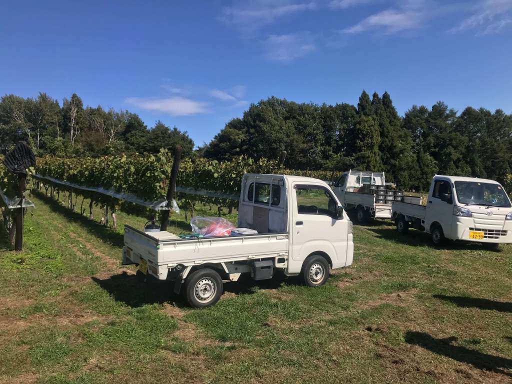 3. The machinery used in the harvesting is limited to the 600cc light mini trucks (colored white) that are omnipresent in Japanese agriculture. Note that they are small and nimble enough to drive between the rows of vines to collect the trays of harvested grapes.