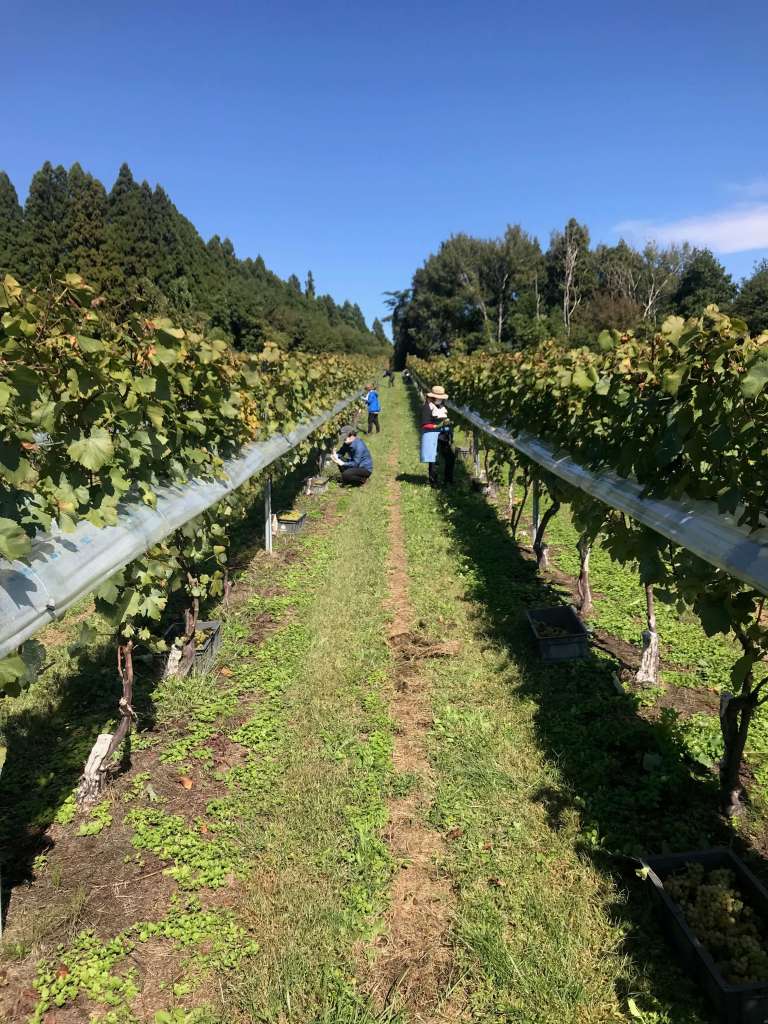 The weather during the October harvest this season was, as is often the case in the area, problematic. We joined the harvest at St. Cousair, spending four days at the winery located in the nearby town of Iizuna at an altitude of 600 meters. This is not high enough yet for snow, but the location like most areas of Nagano is often caught in the cross currents of weather generated by the Pacific Ocean to the west and the Sea of Japan to the east. The fall rainy season, which starts in mid-September, extended well into October this year and resulted in the postponement and cancellation of the days set by the winery staff for the harvest.